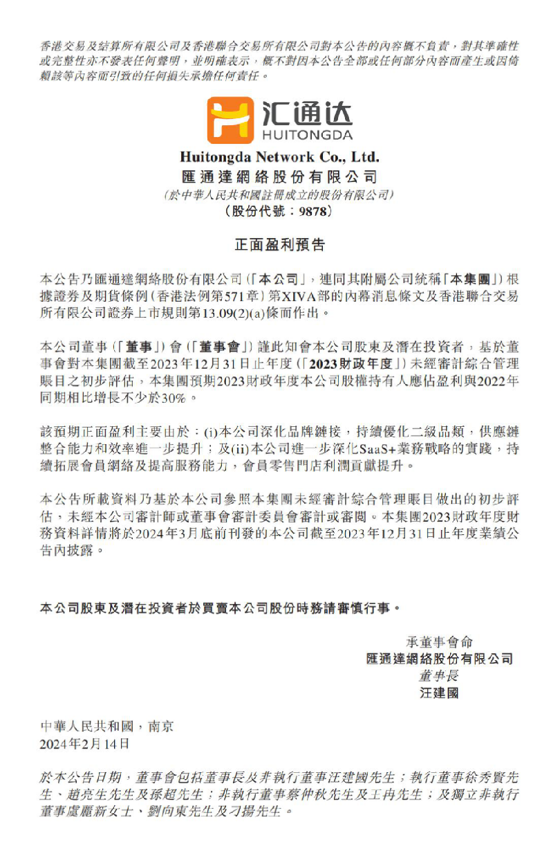 近日,張家口金融控股集團(tuán)有限公司(簡(jiǎn)稱:張家口金控)被投企業(yè)——“下沉市場(chǎng)第一股”匯通達(dá)網(wǎng)絡(luò)(09878.HK)(簡(jiǎn)稱:匯通達(dá))發(fā)布2023年正面盈利預(yù)告——截至2023年12月31日止年度(2023財(cái)政年度),未經(jīng)審計(jì)綜合管理賬目之初步評(píng)估,股權(quán)持有人應(yīng)占盈利與2022年同期相比增長(zhǎng)不少于30%。