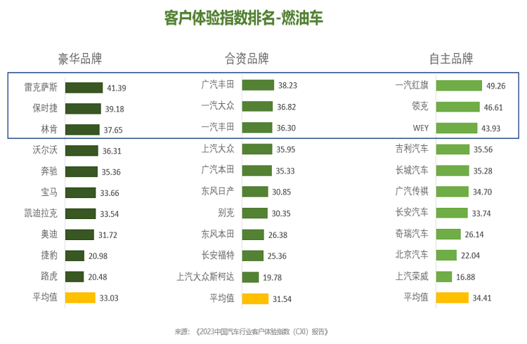 自主品牌、豪華品牌、合資品牌的CXI均值分別為34.41分、33.03分、31.54分,自主品牌整體表現(xiàn)出色,其第一梯隊(duì)的客戶體驗(yàn)已超越豪華品牌,但各自主品牌之間的差距較大。其中,豪華品牌前三名是雷克薩斯、保時(shí)捷、林肯;合資品牌前三名是廣汽豐田、一汽大眾、一汽豐田;自主品牌前三名是一汽紅旗、領(lǐng)克、WEY。