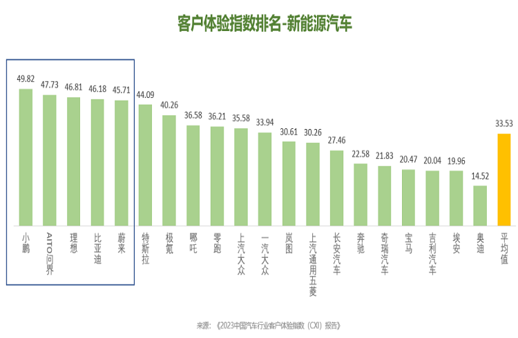 產(chǎn)品CXI的得分普遍較高,以特斯拉、蔚來(lái)、理想為代表的新勢(shì)力表現(xiàn)更佳;從銷售服務(wù)CXI看,以小鵬、問(wèn)界、理想為代表的新勢(shì)力的銷售服務(wù)體驗(yàn)普遍好于傳統(tǒng)品牌;但是,售后服務(wù)的CXI得分整體較低,以上汽大眾、比亞迪、一汽大眾為代表的部分傳統(tǒng)品牌的售后服務(wù)體驗(yàn)相對(duì)較好。