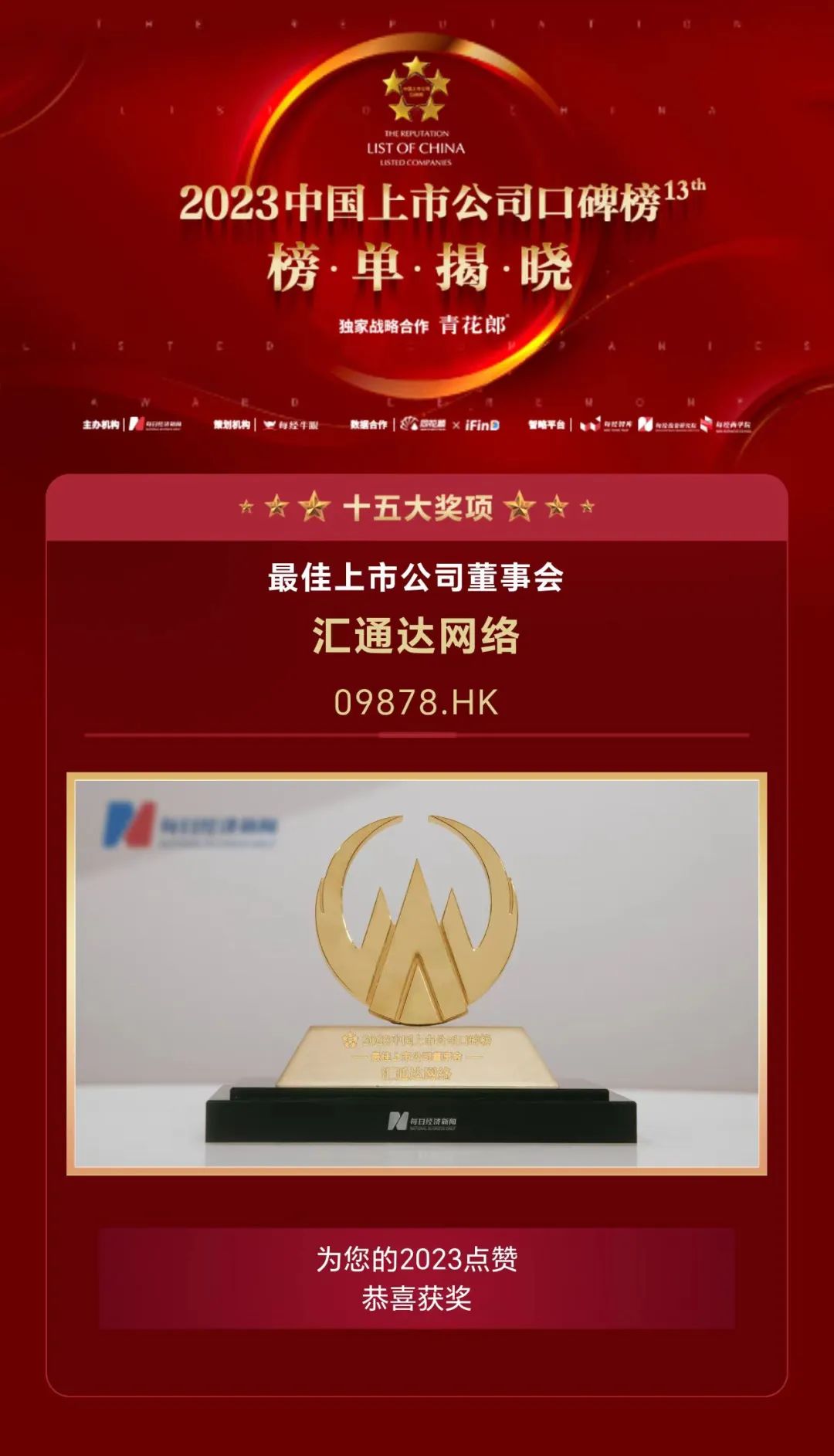 2023年11月16日-18日,由每日經(jīng)濟(jì)新聞主辦的“2023第十二屆中國(guó)上市公司高峰論壇”系列活動(dòng)在四川瀘州舉行。17日晚,備受資本市場(chǎng)矚目的“2023第十三屆中國(guó)上市公司口碑榜”揭榜。張家口金融控股集團(tuán)有限公司(簡(jiǎn)稱(chēng):張家口金控)被投企業(yè)——“下沉市場(chǎng)第一股”匯通達(dá)網(wǎng)絡(luò)(09878.HK)(簡(jiǎn)稱(chēng):匯通達(dá))獲2023第十三屆中國(guó)上市公司口碑榜最佳上市公司董事會(huì)獎(jiǎng)。匯通達(dá)副總裁、董事會(huì)秘書(shū)倪娟代表出席頒獎(jiǎng)典禮。
