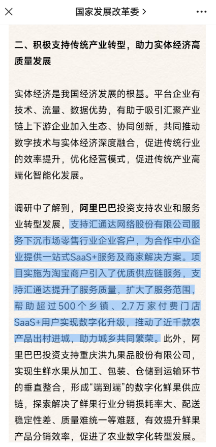 ?2023年7月12日,國家發(fā)展改革委(公眾號(hào):國家發(fā)展改革委)在《平臺(tái)企業(yè)在支持科技創(chuàng)新、傳統(tǒng)產(chǎn)業(yè)轉(zhuǎn)型方面形成了一批典型案例》一文中,將匯通達(dá)網(wǎng)絡(luò)(09878.HK)作為積極支持傳統(tǒng)產(chǎn)業(yè)轉(zhuǎn)型,助力實(shí)體經(jīng)濟(jì)高質(zhì)量發(fā)展典型案例提及——“匯通達(dá)網(wǎng)絡(luò)股份有限公司服務(wù)下沉市場零售行業(yè)企業(yè)客戶,為合作中小企業(yè)提供一站式SaaS+服務(wù)及商家解決方案?!?/p>