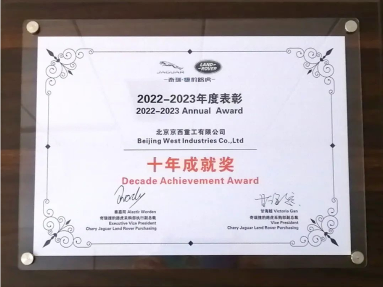 榮獲奇瑞捷豹路虎2022-2023年度表彰——十年成就獎(jiǎng),該榮譽(yù)不僅是對(duì)十年合作豐碩成果的表彰,更代表客戶(hù)對(duì)于京西集團(tuán)在不懈創(chuàng)新和推進(jìn)行業(yè)發(fā)展的認(rèn)可。