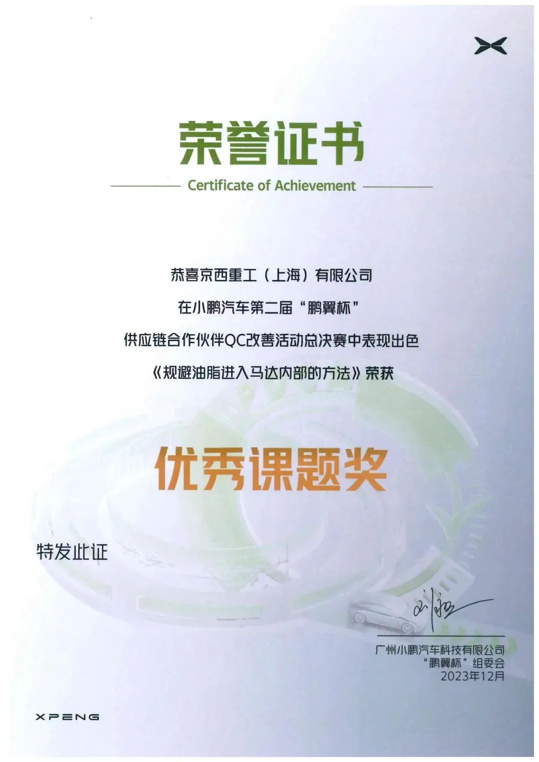 榮獲小鵬汽車(chē)第二屆“鵬翼杯”優(yōu)秀課題獎(jiǎng)。憑借穩(wěn)定優(yōu)秀的品質(zhì)和研究項(xiàng)目《規(guī)避油脂進(jìn)入馬達(dá)內(nèi)部的方法》及其突出改善成果得到客戶(hù)高度認(rèn)可。
