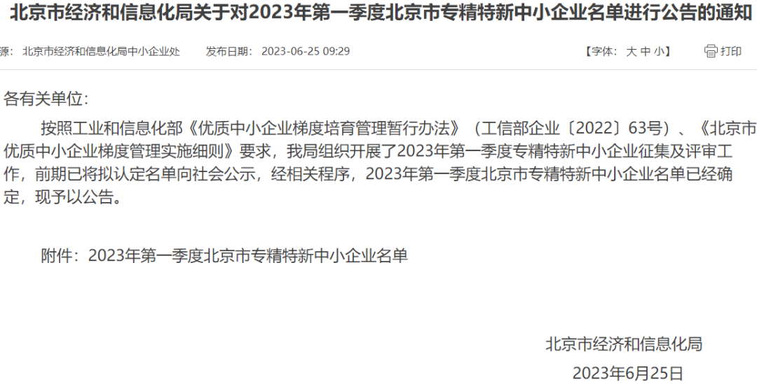 獲評(píng)北京市專(zhuān)精特新中小企業(yè)