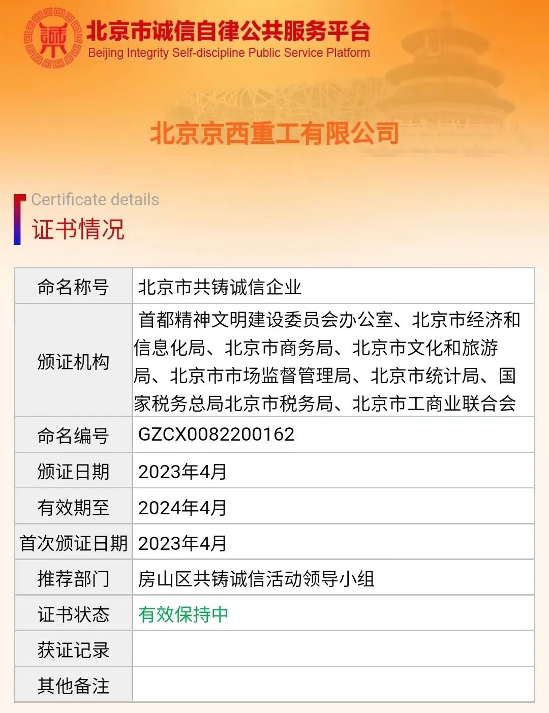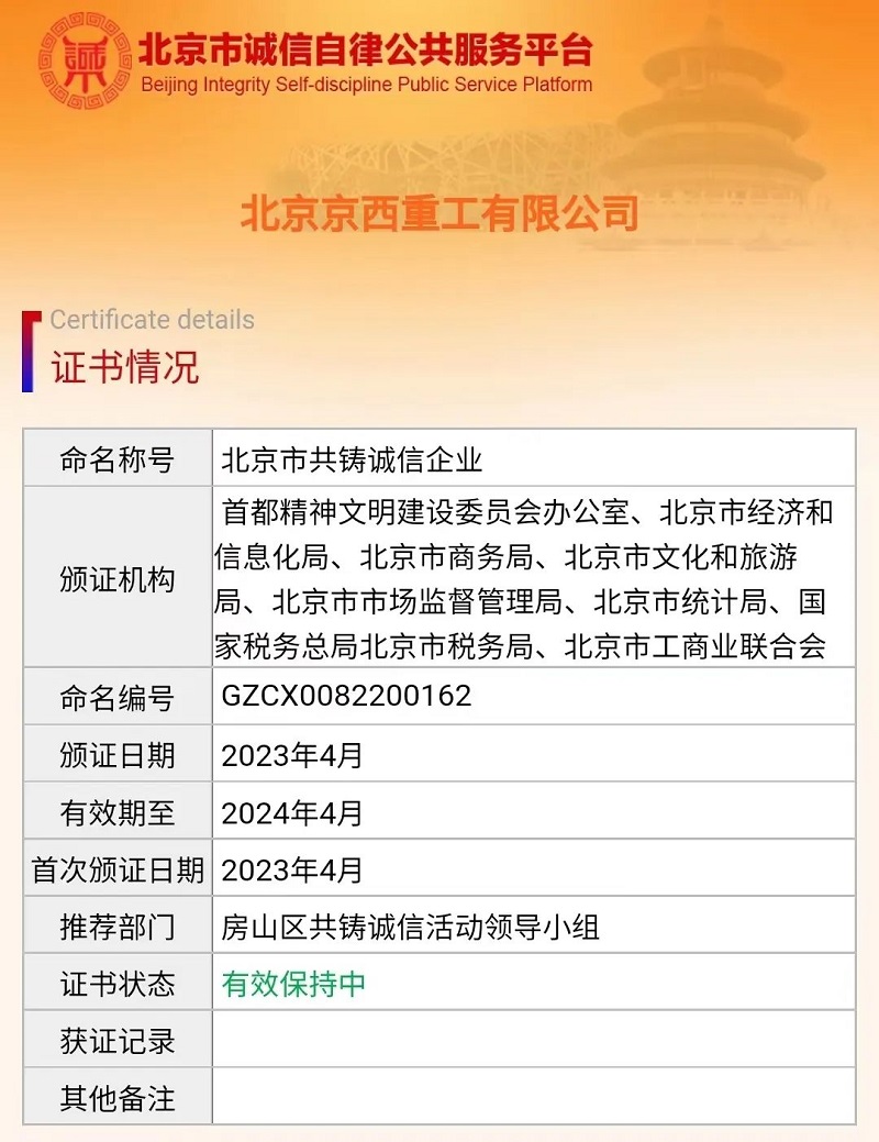 ?此次成功榮獲“北京市共鑄誠信企業(yè)”稱號,是對公司誠信經(jīng)營和良好口碑的高度認(rèn)可。以誠信為本,互信互助,賦能公司高質(zhì)量發(fā)展。接下來,京西重工將繼續(xù)堅(jiān)持誠信為本原則,不斷完善誠信管理制度,持續(xù)提高企業(yè)的誠信意識和信用管理水平,追求卓越、真誠合作、把關(guān)產(chǎn)品、奉獻(xiàn)社會。