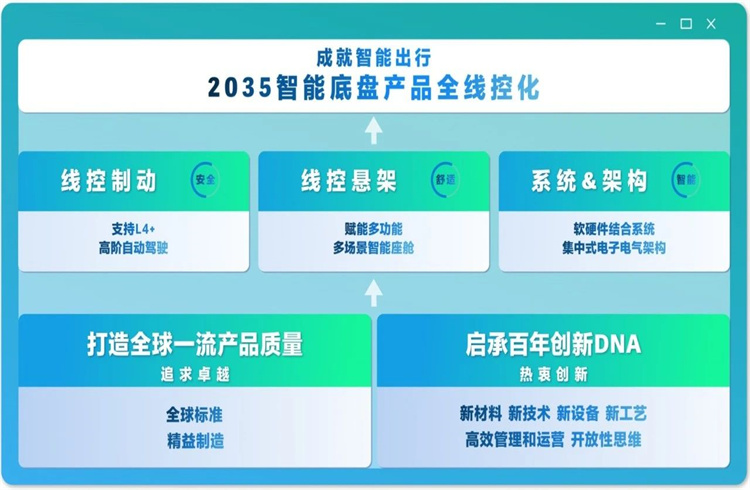 京西集團(tuán)全球CEO鄭潔亮宣布的全球技術(shù)戰(zhàn)略明確了面向未來十年的戰(zhàn)略目標(biāo)——2035年實(shí)現(xiàn)智能底盤產(chǎn)品全線控化。該戰(zhàn)略以線控制動、線控懸架、系統(tǒng)及架構(gòu)為三大核心支柱,并以全球一流產(chǎn)品質(zhì)量、百年創(chuàng)新DNA為兩大基石。