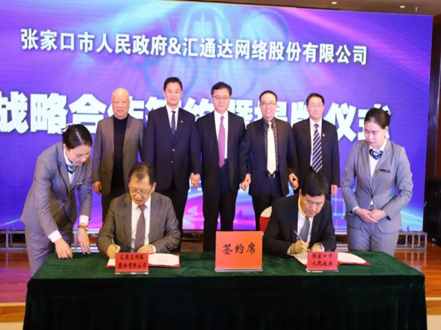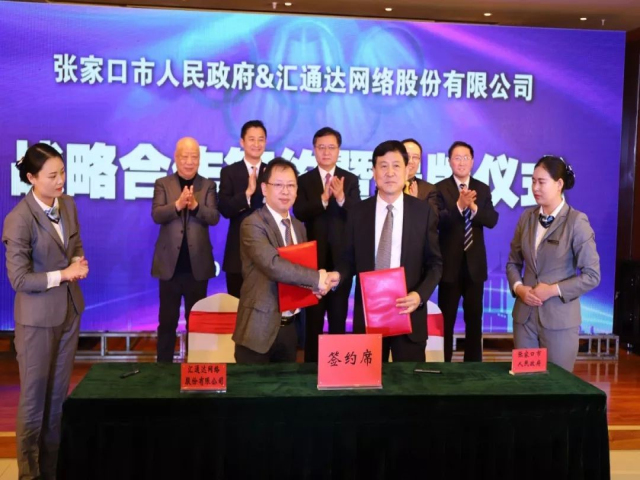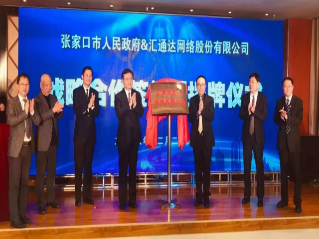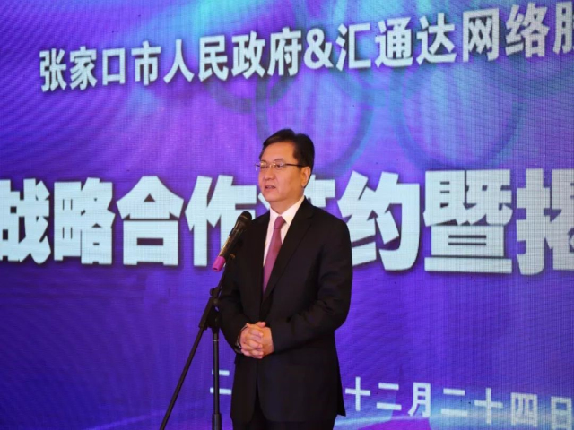 2018年12月24日,張家口市人民政府與匯通達(dá)網(wǎng)絡(luò)股份有限公司舉行戰(zhàn)略合作簽約暨揭牌儀式。張家口市政府市長武衛(wèi)東、市政府常務(wù)副市長郭英、市政府秘書長楊千河、橋東區(qū)委書記王建軍、五星控股集團(tuán)總裁王健、匯通達(dá)副總裁趙亮生、中美綠色基金CEO 白波、金控集團(tuán)總裁東小杰、金控集團(tuán)副董事長昝杰亮、市直區(qū)直相關(guān)部門主要負(fù)責(zé)同志及相關(guān)企業(yè)高層管理人員近60人出席本次活動(dòng)。楊千河秘書長主持簽約暨揭牌儀式。