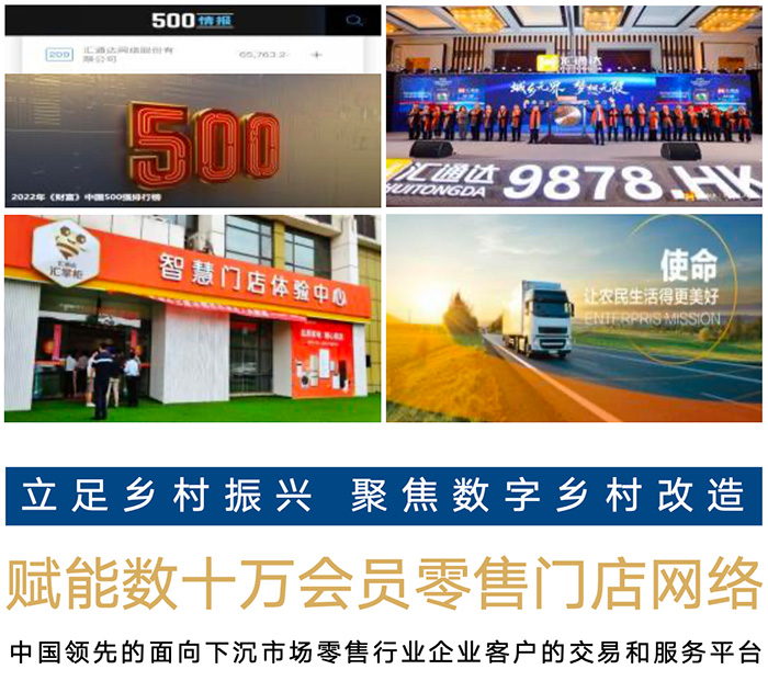 匯通達由原五星電器核心管理團隊創(chuàng)立,致力于鄉(xiāng)鎮(zhèn)市場的農(nóng)村個體商店,構建起深達農(nóng)村底層市場的經(jīng)銷與服務網(wǎng)絡。2018年4月,阿里巴巴集團宣布向匯通達投資45億元,匯通達估值由105億元增長至225億人民幣,獲評“中國互聯(lián)網(wǎng)企業(yè)100強”、“全球獨角獸企業(yè)500強”和“中國民營企業(yè)500強”等榮譽稱號。